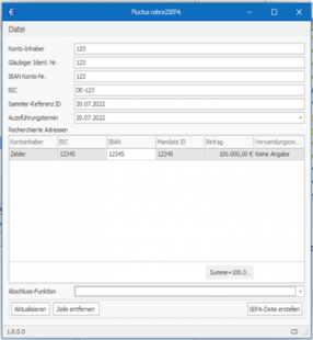 Fluctus cobra2SEPA ist eine Erweiterung für das Customer-Relationship-Management-System cobra. Sie erfasst alle relevanten Daten aus einer cobra-Recherche und wandelt sie in eine standardisierte XML-Datei um, die sich in gängige SEPA-Tools integrieren lässt. Dadurch wird der Prozess der Zahlungserstellung deutlich vereinfacht und beschleunigt. Darüber hinaus bietet cobra2SEPA eine übersichtliche Darstellung über die erfassten Finanzdaten und ermöglicht eine gezielte Nachbearbeitung, bevor die SEPA-Datei erstellt wird.